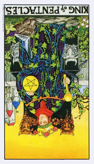 The King of Pentacles uses his Earthly attributes to rule. He goes about his work like an old style business man; he avoids unnecessary risks, aims for real results, and acts from confidence.