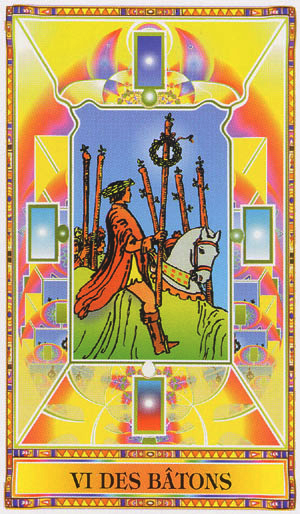 The 6 of Wands represents victory (over yourself maybe). 6 is the number that represents the rewards of hard work, which you did in card 5. When a 6 of Wands is in your game, you might be feeling a little proud with your accomplishments. But some modesty might help you shine even better.