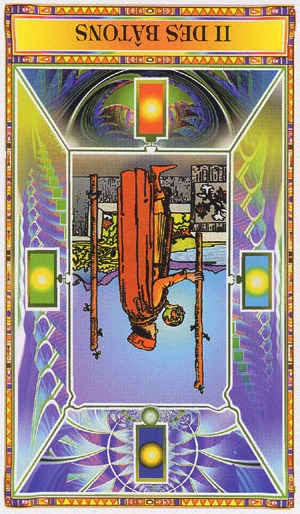 The 9 represents rest after work, which is another thing (like 8) that the element Fire associated with Wands is not very comfortable with. Fire likes to keep going. This rest will probably be spent thinking about what to do next along the course to completion.