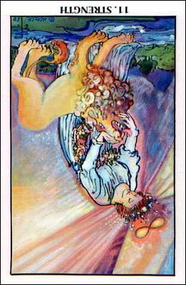 This card carries the number 11. In the Rider-Waite deck, Strength and Justice have swapped places because Waite saw links with the astrological signs Leo and Libra.